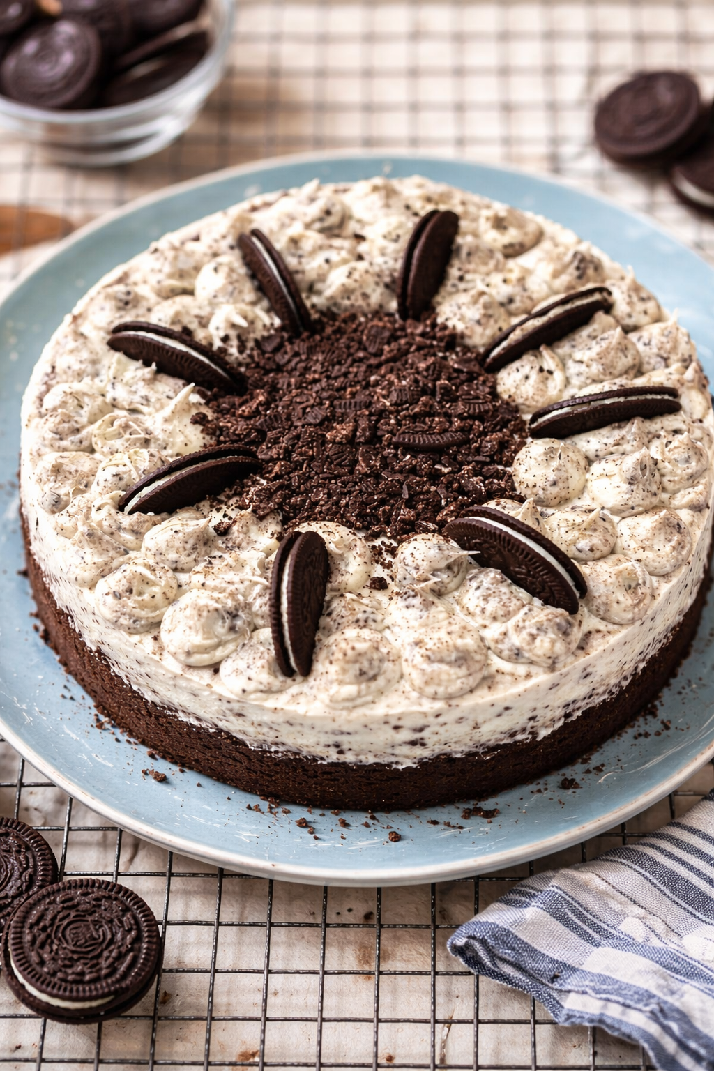 Decorate with piped frosting and additional crushed Oreos or Oreo halves.